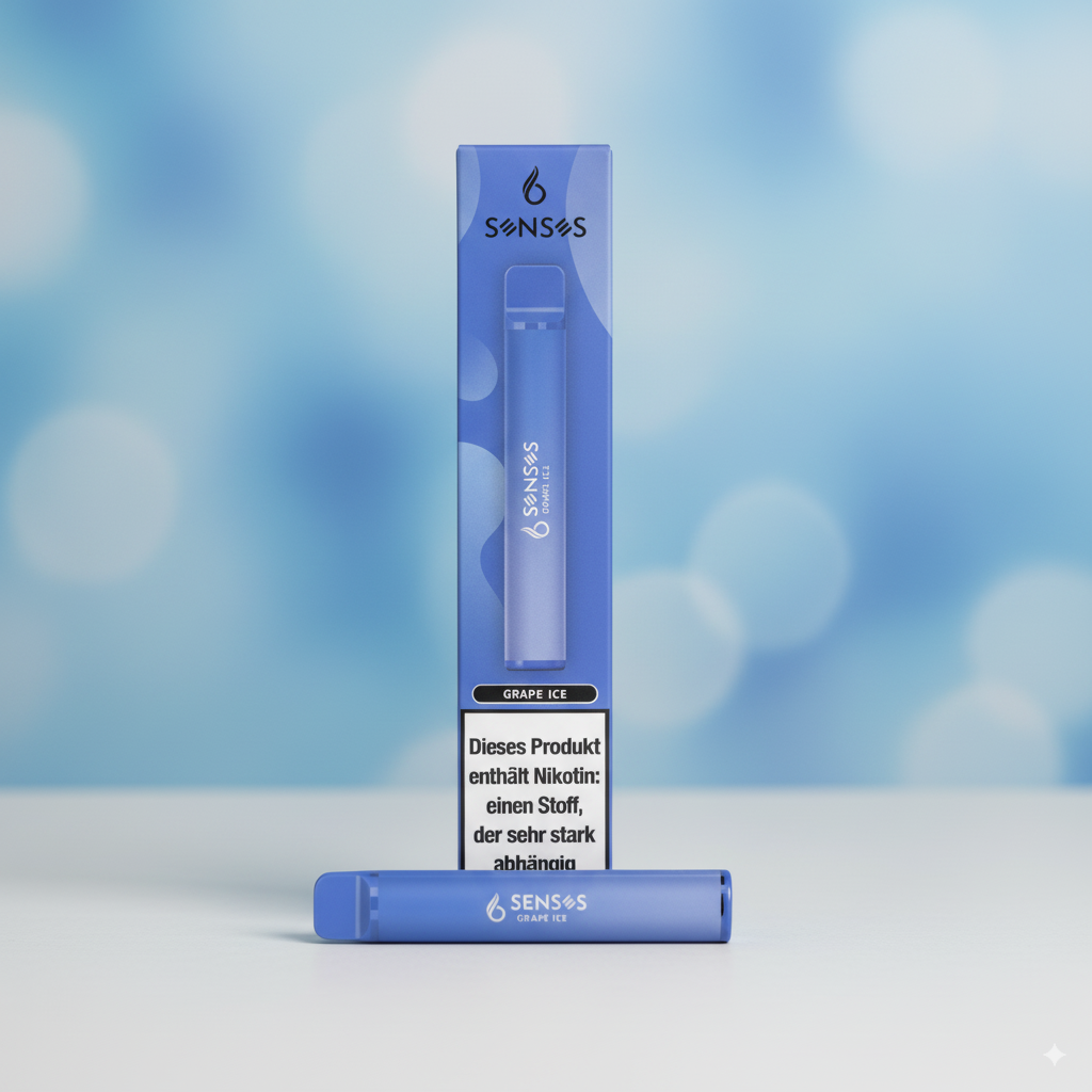 6 SENSES Bar Mini 600 Züge Geschmack: Trauben Ice Kapazität: 2.0 ml Liquid Nikotinsalz: 2% Akku: 550mAh Zutaten: Pflanzliches Glycerin, Propylenglykol, Nikotin, natürliche und künstliche Aromen